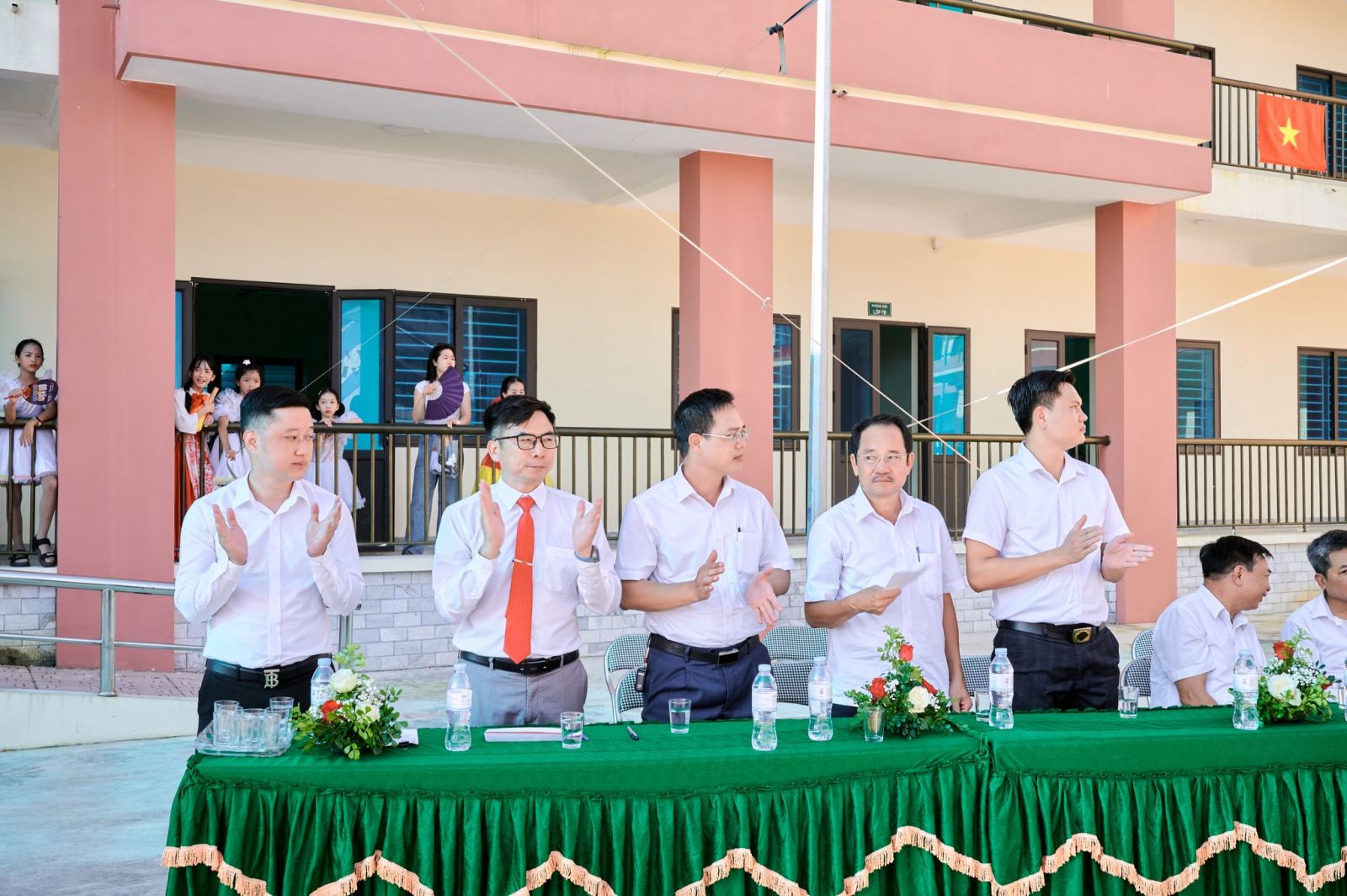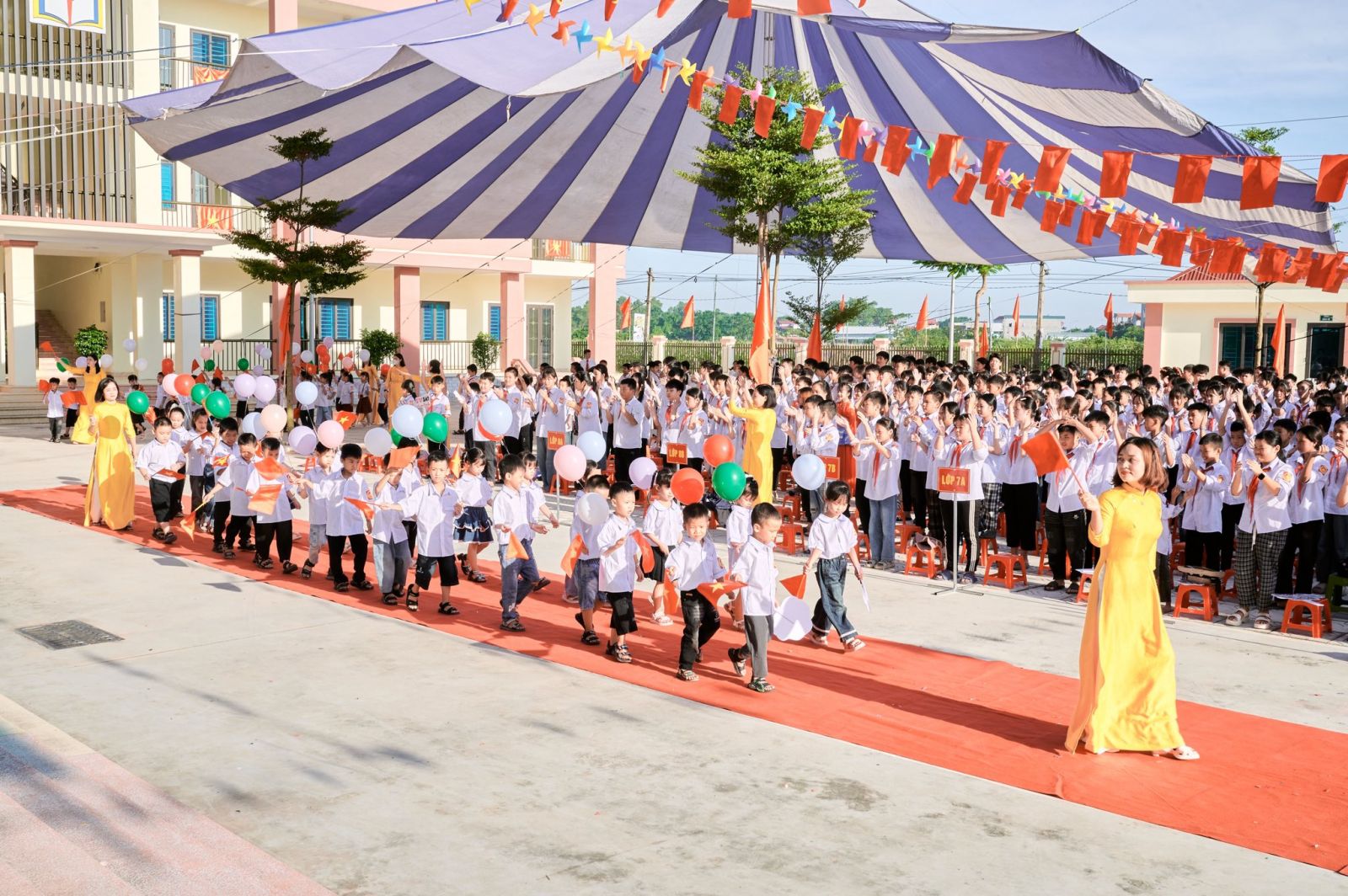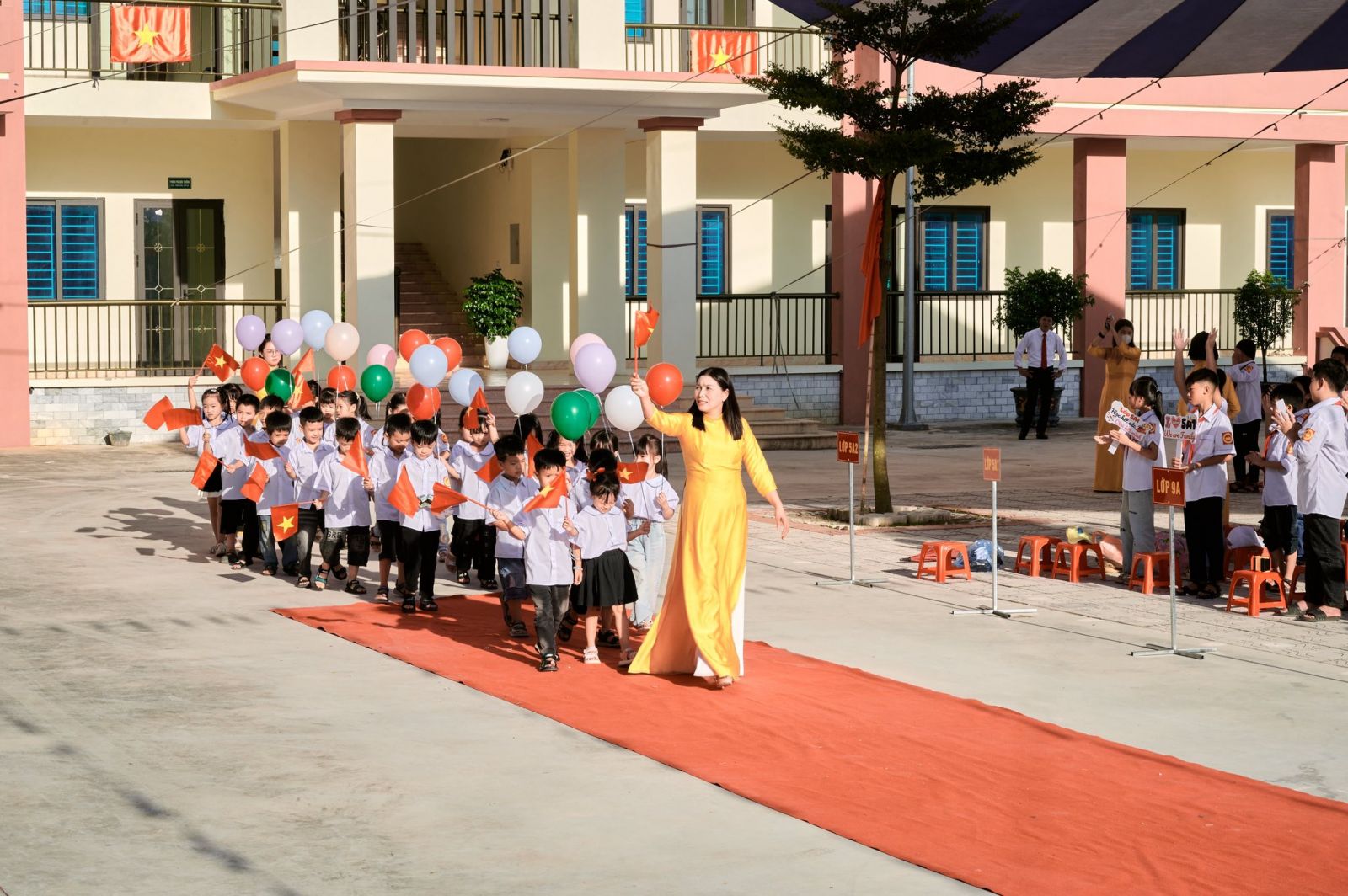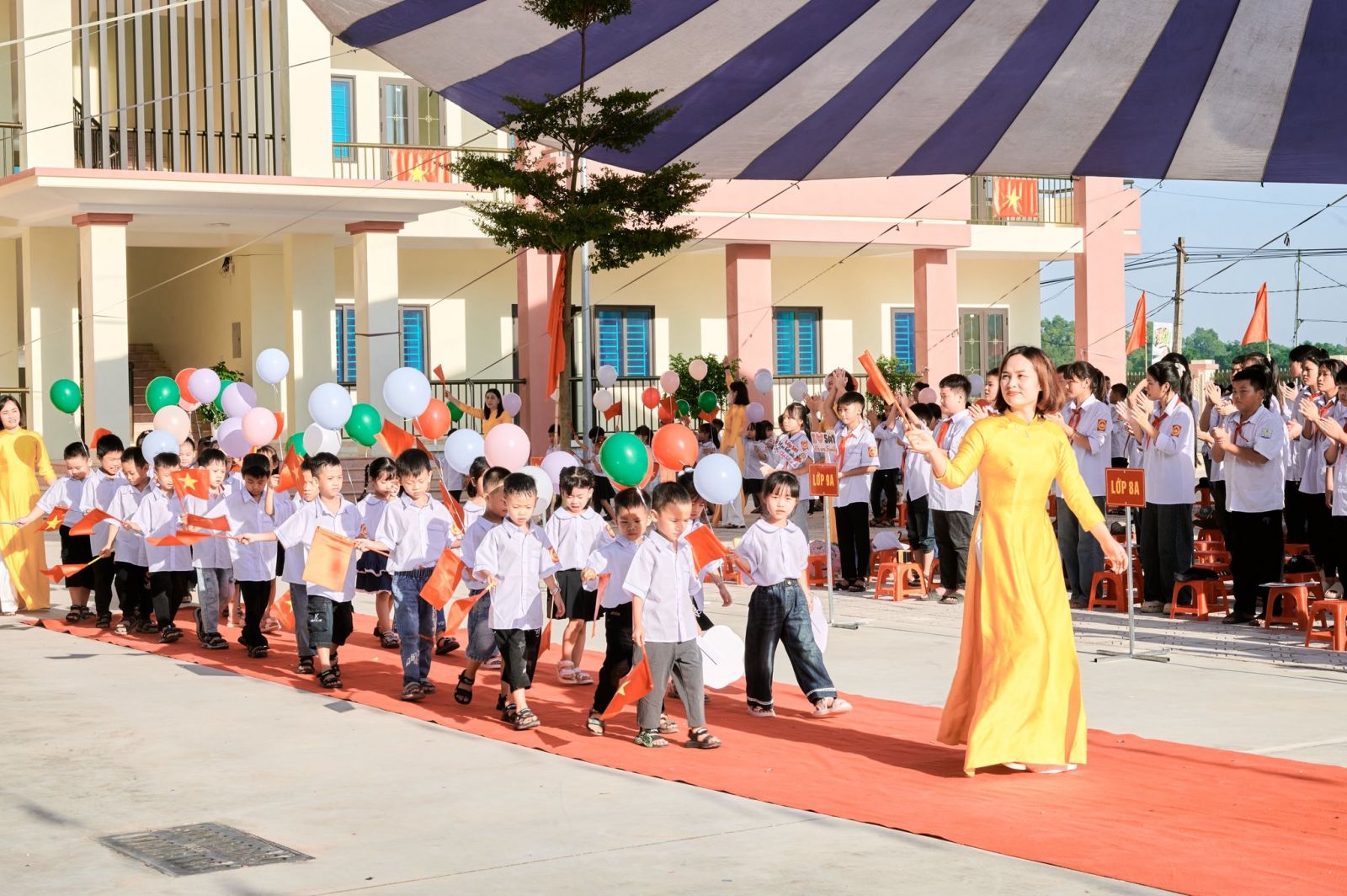 Một điểm nhấn đặc biệt của buổi lễ hôm nay chính là nghi thức đón học sinh lớp 1. Các em nhỏ hồn nhiên, trong sáng, trong bộ đồng phục mới tinh khôi đã chính thức bước vào mái trường Tiểu học – mở ra một hành trình học tập mới, tràn đầy niềm tin và ước mơ. Sự chào đón nồng nhiệt, những bó hoa tươi thắm, những tràng pháo tay rộn ràng đã gửi gắm biết bao tình yêu thương, niềm tin tưởng và hy vọng từ thầy cô, cha mẹ và bạn bè.